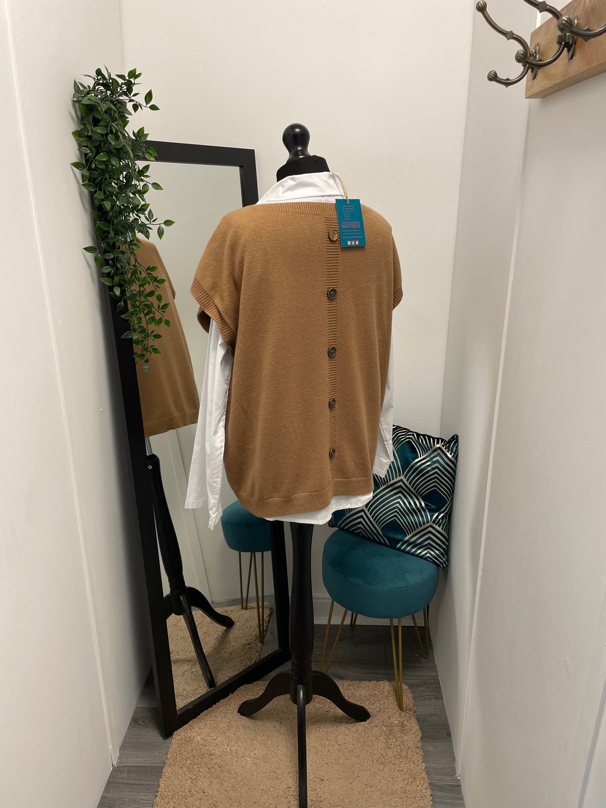 This stylish two-piece set includes a classic white shirt and a soft knit overlay with decorative buttons down the back.